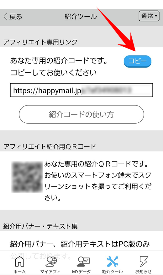 紹介リンクは、トップページ→アフィリエイト→紹介ツールから「コピー」を押して取得できますよ。